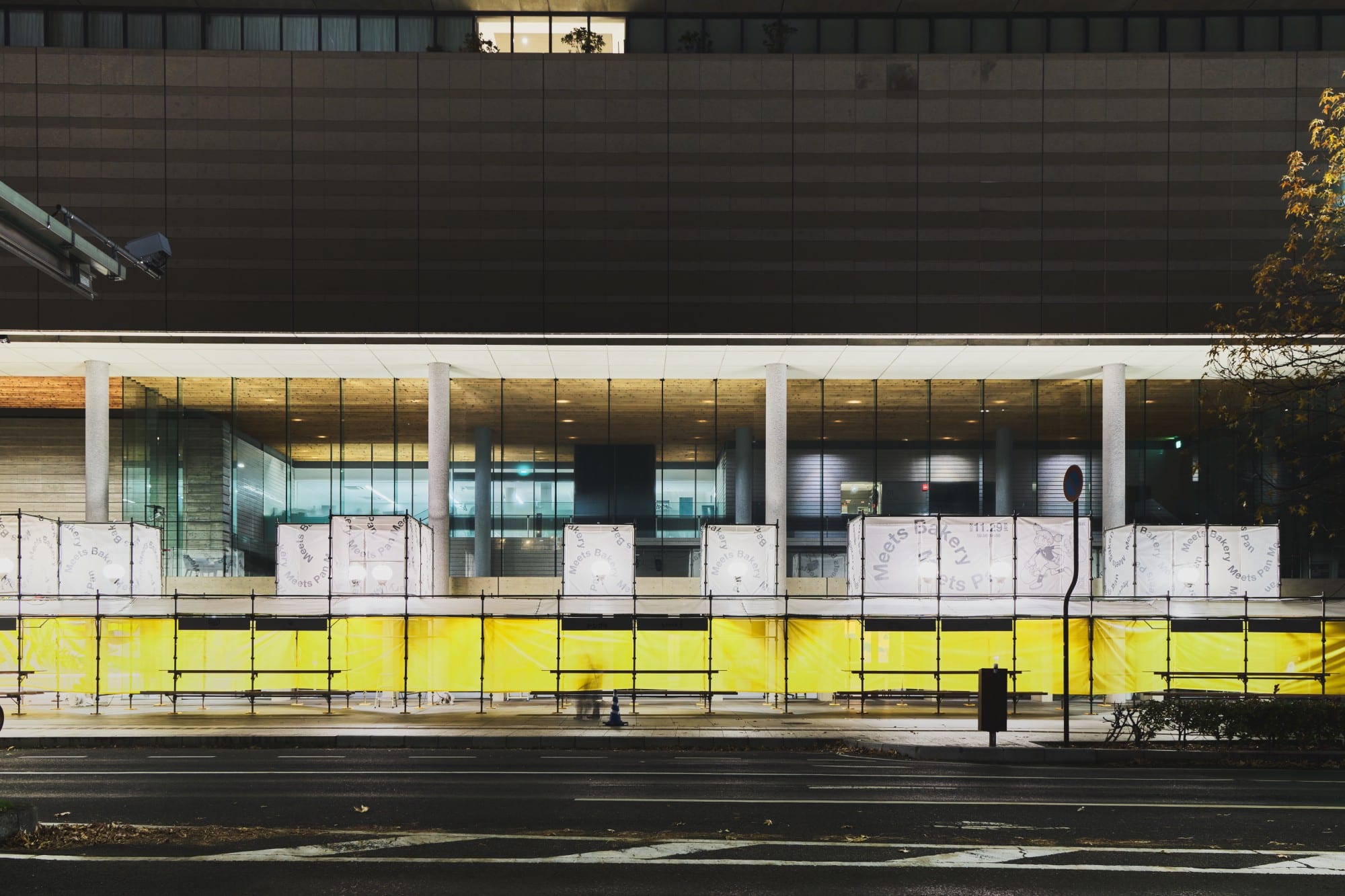 一日限りのイベントであることを踏まえ、建築現場で用いられる単管足場と、養生用のメッシュシートを主要素材として採用。 限られた条件の中で、軽快さと視認性を両立した、仮設ならではの表現を模索しました。